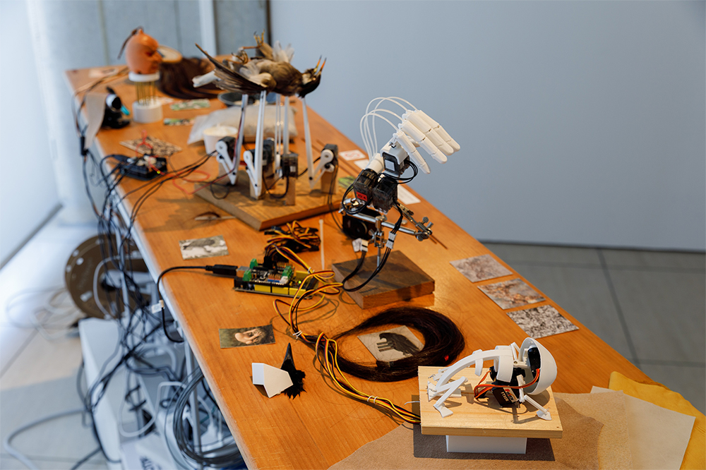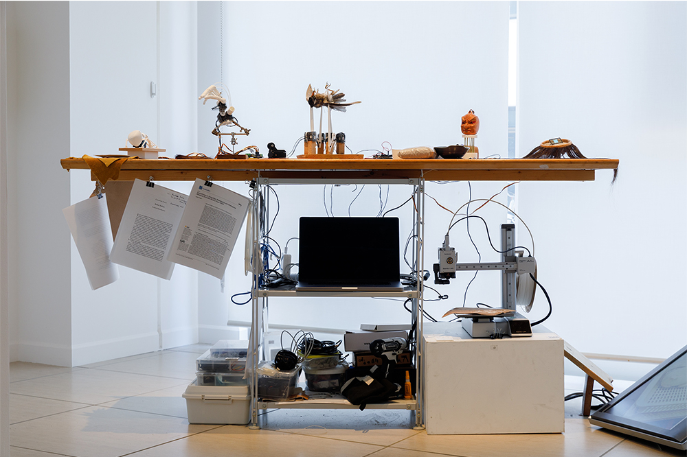Looking at animals as commodified bodies in the context of late capitalism, I pursued my ongoing artistic research at the intersection of art, technology and robotics. My goal was to conceptualize and advance the development of a new series of artworks that involve hybrids of animal and human representations, using sculpture, media and robotics. Drawing from chimeras in japanese folklore, animism and shinto, I developed a concept around the themes of “otherness”, broached ideas of digital intertwining and contemporary surrealism.
